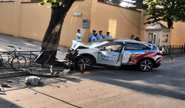 Drejtuesi i një taksie nga kompania “Blue Taxi” humbi kontrollin mbi mjetin e tij, duke u përplasur fillimisht me kangjellat anësore të rrugës dhe më pas me një pemë.