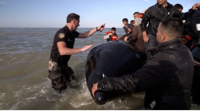 Një nga gomonet ishte mbushur dhe ndodhej rreth 100 metra larg bregut, ndërsa një tjetër, thuajse bosh, po afrohej për të marrë pjesën tjetër të grupit. Emigrantët, shumica me jelekë shpëtimi, u futën në ujë për të arritur mjetin lundrues, ndërsa një anije e rojes bregdetare franceze mbante distancë nga bregu.