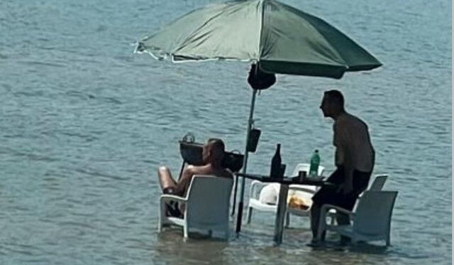 Në një foto që është bërë virale në rrjet, dy miqtë shfaqen të ulur me karriget e tyre brenda në ujë, të mbrojtur nga një çadër, me një zgarë ku piqet mishi, birrat në dorë dhe asnjë shezllon me çmim të kripur apo muzikë të zhurmshme që prish qetësinë. Me një prekje humori dhe kreativiteti, ata kanë krijuar një ambient relaksues në mes të natyrës – pa fatura, pa stres dhe pa radhë.