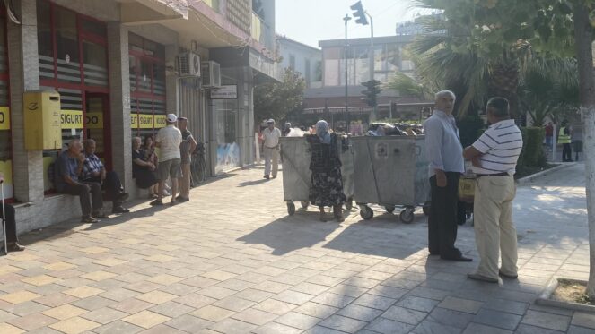 Në Fier, pensionistët nuk presin vetëm me orë të tëra për të marrë pensionin qesharak, por duhet të përballen edhe me një tjetër torturë: erën e rëndë të plehrave nga koshat pranë zyrës së postës.