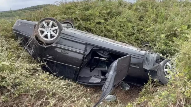 Një automjet tip “ Benz” ka dalë nga rruga duke përfunduar i përmbysur në kabalin anësor të rrugës.