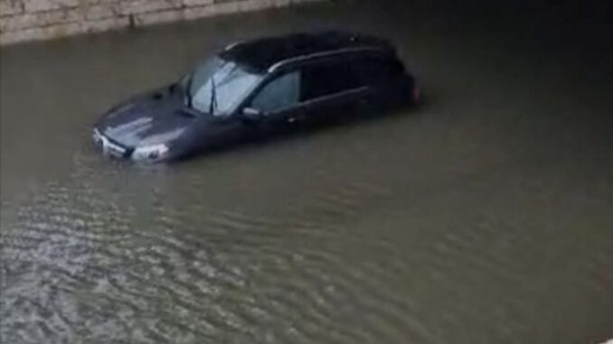 Shumë kryqëzime rrugësh janë nën pushtetin e ujit, ndërsa sikurse duket në pamje, edhe një automjet ka mbetur i bllokuar.