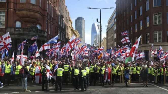 Më shumë se 100,000 persona janë mbledhur këtë të shtunë në qendër të Londrës për të marrë pjesë në marshimin “Unite the Kingdom”, i organizuar nga aktivisti i ekstremit të djathtë, Tommy Robinson. Ngjarja ka ngritur shqetësime të mëdha për sigurinë publike, ndërsa në një tjetër pjesë të qytetit po zhvillohet një kundër-protestë e organizuar nga lëvizja Stand Up To Racism, me moton “March Against Fascism”.