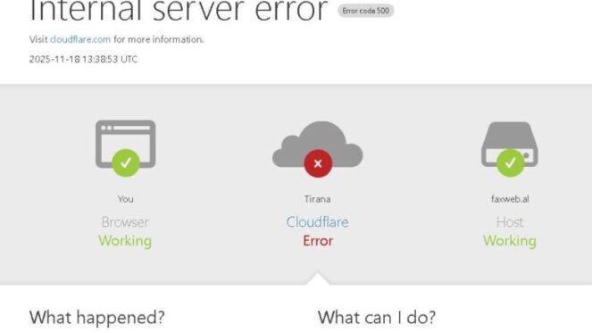 Interneti po përballet me probleme serioze në disa vende të botës, pasi një defekt i gjerë në shërbimet e Cloudflare ka shkaktuar ndërprerje të aksesimit në shumë faqe dhe platforma të njohura. Përdorues nga Europa, Amerika dhe Azia kanë raportuar gabime të tipit “500 Internal Server Error” dhe vështirësi në ngarkimin e shërbimeve online.