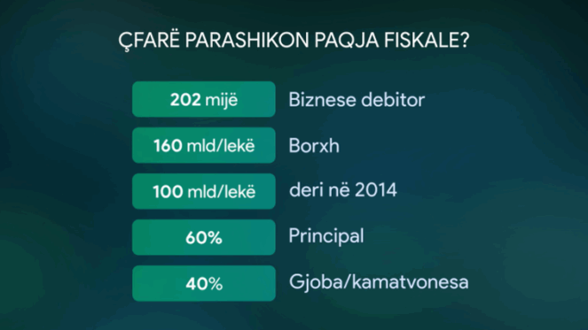 Fshirje e Borxhit: Do të fshihet automatikisht borxhi i tatimeve dhe doganave i akumuluar deri në vitin 2014, i cili arrin në 160 miliardë lekë për 202 mijë biznese.