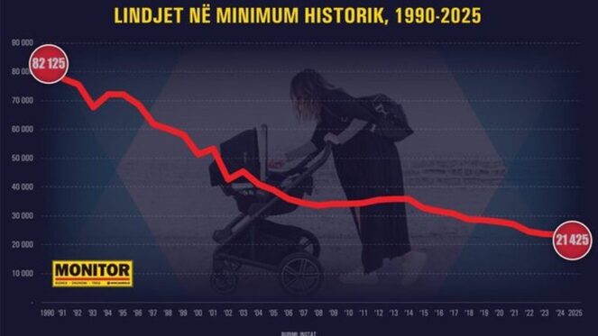 Në 2025-ën në Shqipëri lindjet ishin 74% më të ulëta se në 1990-ën